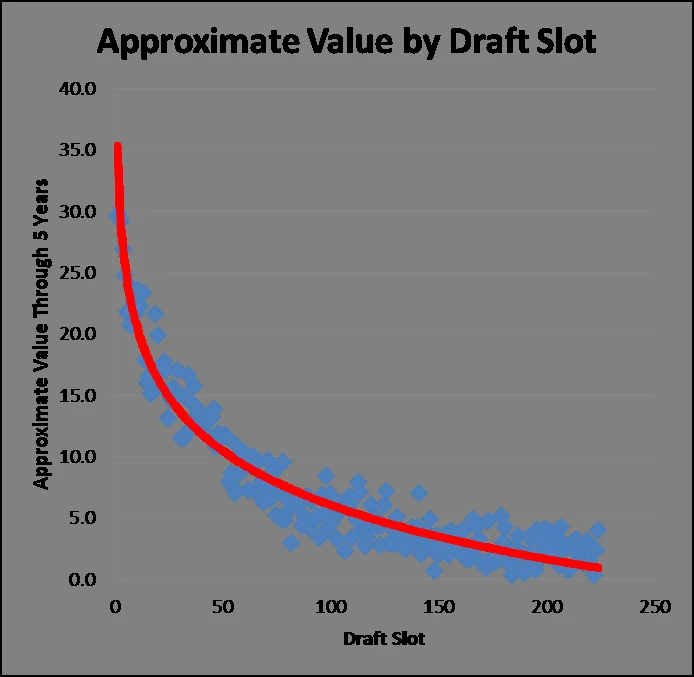 Aber es gab ein Problem. Die Johnson-Chart überschätzt die Top-Picks massiv. Sie behandelt den Unterschied zwischen Pick 1 und Pick 5 wie einen Grand Canyon, obwohl historische Daten zeigen, dass die Hit-Rate auf diesen Picks fast identisch ist. Anders gesagt: Wer in den 90ern die Chart benutzte, zahlte chronisch zu viel für Move-Ups in die Top 5.